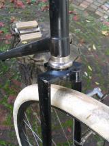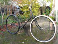 This one is not fully complete, but it has interesting details like the pneumatic tyres, the slightly curved saddle tube and the direct spokes. The pneumatic tyres of this 'balloon' type present a problem for the 21st century restorer. Front wheel needs a 30 inch tire and this size is obsolete. Thats why most owners decide to place dummy tyres or solid ones - very heavy.